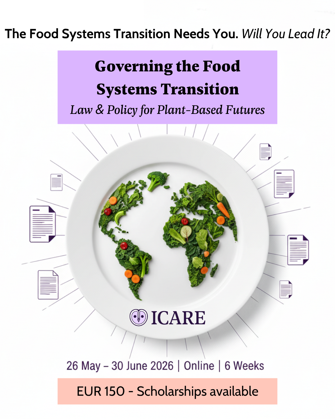 In keeping with ICARE’s mission and values, we especially encourage registration from individuals whose perspectives and lived experiences have been underrepresented in legal and advocacy spaces. We believe that strengthening the field of animal rights law and food systems transition requires a diversity of voices, backgrounds, and approaches—and this course is designed to support that vision.